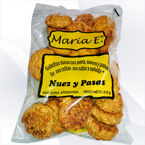 Galletitas dulces con avena, nueces y pasas de uvas rubias, con sabor a vainilla. Tenor graso 9,80 %. Ingredientes: Harina 0000 enriquecida ley 25,630, agua, azucar, avena, jarabe edulcorante nutritivo ( fructosa- dextrosa - maltosa - maltotriosa), aceite de girasol, nueces, pasas de uva rubia, huevos, fécula de maiz, sal , leudante quimico: bicarbonato de sodio INS 500il, saborizantes: esencia artificial de vainilla, de naranja dulce y limon. Mantenga el producto en lugar fresco y seco en su propio envase cerrado o en recipiente.